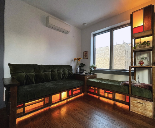 I created a concept of a backlit sofa and with the help of a carpenter was able to bring this vision to life. My clients in Brooklyn needed furniture sourced for their upstairs loft but the measurements made it tough to find a sofa and some sort of bench or chair under the window while still needing a coffee table, bookshelf and lighting. With their budget far from custom range I knew I had to get creative.. That's when I met Blu from a facebook group and went to his shop to discuss framing options. He had handmade wooden lamps in his studio and that was when the idea came to mind to blend light into the sofa frame itself. Once the clients were on board I sourced the fabric from Zarin fabrics and got to work hand sewing the cushions. All in all this was an incredible process and Blu has now shifted from lamps to backlit furniture as the requests after this project have been flooding in!